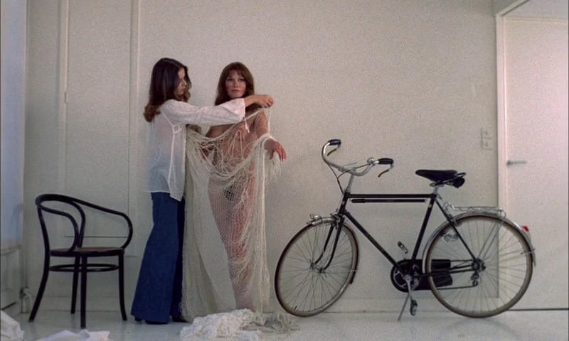 After a few minutes it starts, though "starts" is relative with these films. A lady dressed in spider webs and doilies gets undressed from her spider webs and doilies. The sight lines are strange. Her friend paints on her, then shrieks.