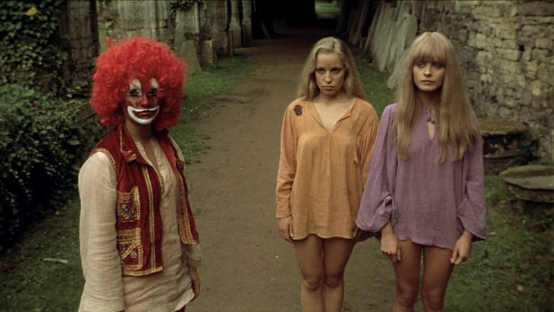 And then... and then there's a clown. An actual clown. The clown lady guides the half-naked ghost girls through "the haunted ruins" to meet some hippy priest, where the clown asks for permission to take care of them. It's entirely unclear what is going on, but the next shot of the priest from behind the bars of a jail cell is flawless. There is some important man in the jail cell (who we will soon learn is a demon who can only be released by innocent victims). The priest monologues into the camera. The clown gets the ghosts some new clothes, but apparently only has shirts, so they just wear some billowy 60s hippy shirts and nothing else.