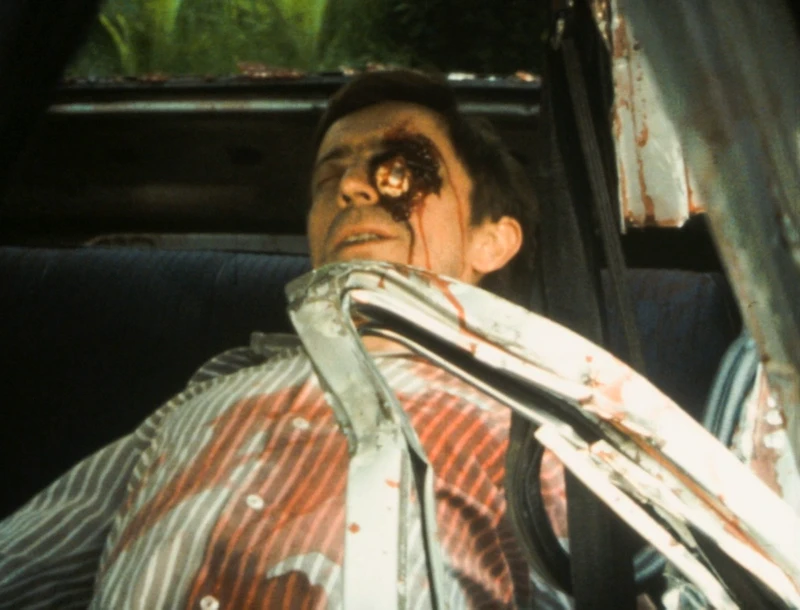 After the pissing, we immediately get a big car crash. Blood and guts everywhere. A cleanup crew drives to the scene of the accident while a soundtrack of ominously haunting electronic organs sets the mood.