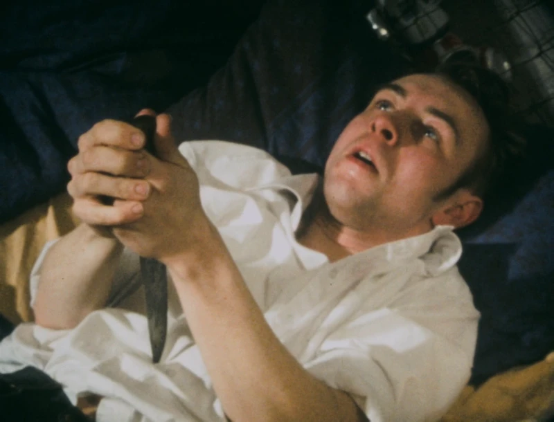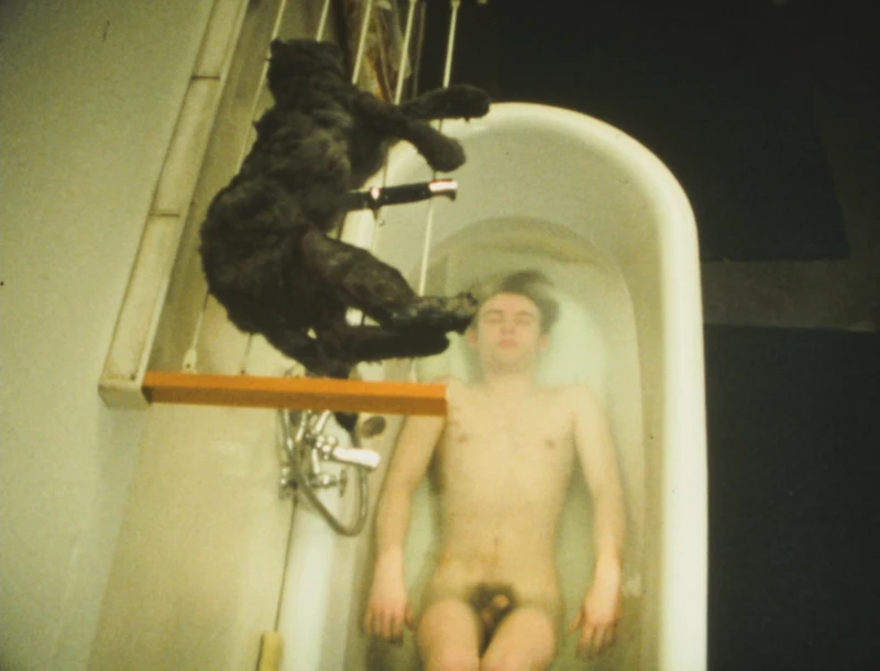 He gets a (living) cat that looks just like my (living) cat, though he puts his in a trash bag and beats it to death. There's a great long shot of him naked in a bathtub, completely motionless, with a dead cat on the table above him dripping blood down into his bath water.